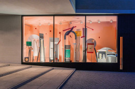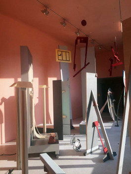 For the fourth exhibition of the RADAR series, the LWL Museum for Art and Culture and the Westfälischer Kunstverein invited Verena Issel from Hamburg. For the cooperatively used space between the two institutions, the artist arranged an installation titled Aset in Tadmor, which stages the large window as the display side. The glass pane acts as the fourth wall, turning the otherwise accessible exhibition space into a showcase only visible from the outside. Inside, the walls are dominated by the color pink. Various constructions and objects are distributed across the exhibition space, with one side facing the viewer. They formally reference window displays, stage designs, and set architectures. The supported surfaces inevitably evoke the added facades of Münster’s Prinzipalmarkt. Verena Issel mounted architectural features made of foam and fragments from various materials, such as brown plastic flower pots, onto mainly light gray and pastel-colored wooden elements. With short lifespans, they stand in contrast to their referents: antique column forms, ceramic shards, arches, and massive walls. Everything is a backdrop. Bright spotlights additionally illuminate the scene, resembling both a tourist-prepared ancient site and, at the same time, a battlefield with wood elements resembling targets. Sarcasm finds its way through the pink space. Questions about the transience of historical buildings and relics of ancient cultures, the handling of destroyed sites, their possible reconstruction, and the preservation of objects in museums penetrate through the glass pane.