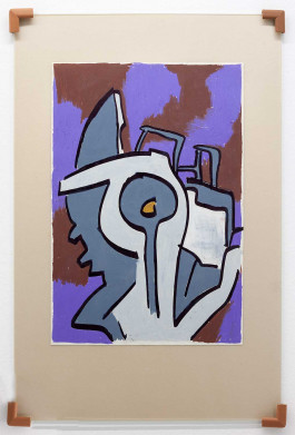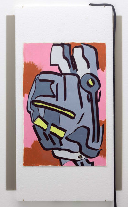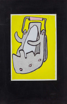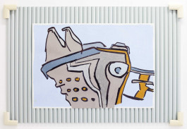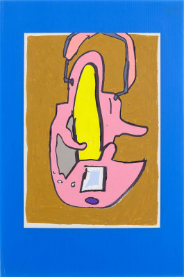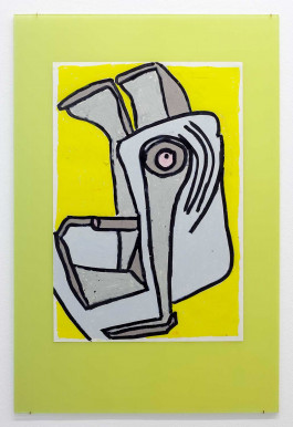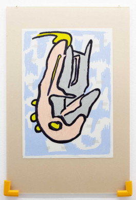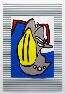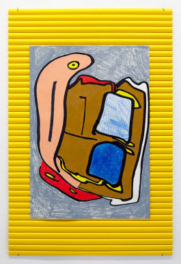 2019, wax crayons and oil pastels on paper, adhesive tape, acrylics, Japanese bouncer, glass, 42 × 63 cm