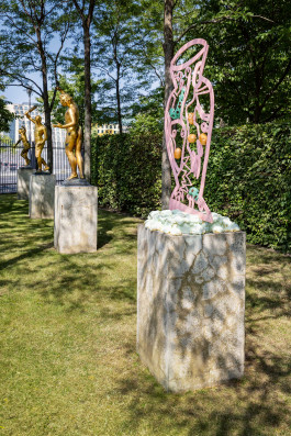 Niedersachsen, with bronze copies from 1974 on display in the embassy of Niedersachsen in Berlin. This historical ensemble in Berlin is occasionally interrupted by contemporary sculptures. The latest sculpture is by Verena Issel. Like the gilded figures, the artist copies historical models. In Issel’s case, this is an ancient vase whose motifs simultaneously borrow from the Baroque. Upon closer inspection, Baroque ruffs, corsets, and hoop skirts can be found on the two-dimensional metal disc. But that’s not all—in addition to references to antiquity and the Baroque, the artist combines typical materials from the area of Niedersachsen with universal high-tech materials. The signature staple of Niedersachsen, the Niedersachsen potatoes, meet industrial steel, and the likewise classical Niedersachsen sheep wool meets metal. A confusion in pink that playfully quotes and seems to wander through the centuries. An illusionistic drawing that pretends to be a vase but remains trapped in the second dimension.