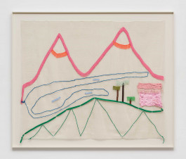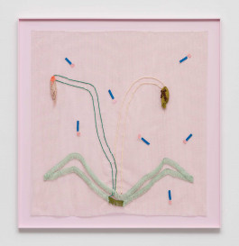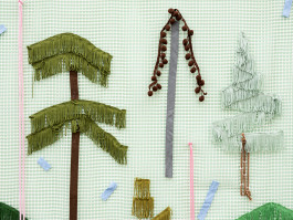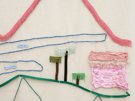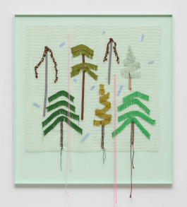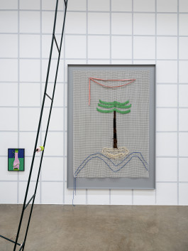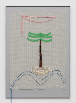 Another layer consists of pictures made of anti-slip mats. These mats are used to prevent carpets from slipping, so that everything stays where it belongs. Landscapes made of acrylic thread, curtain fringes, and ribbons are threaded and sewn into these titular grids. In this way, Issel brings to life dreamlike landscapes, lost palm trees, images of a paradise that probably never existed. Palm trees, beaches, coconuts, sea cucumbers, and other exotic-looking plants tell of the fact that the paradise conjured up in advertising is nothing more than the constructed idea of a tourist industry whose success is always destroying the very basis of this success. “Come visit unspoiled nature. Enjoy the peace and quiet!” screams the advertising, luring you in with photos that have been manipulated beyond recognition and resemble Issel’s plastic replicas more than what nature actually produces.