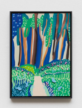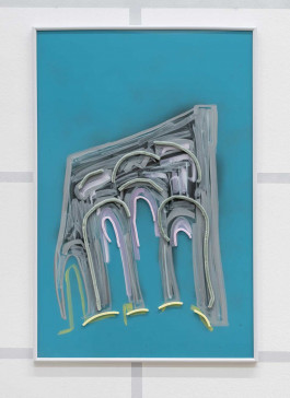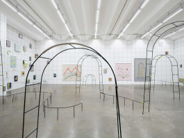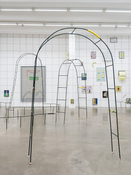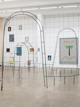 Yet another layer of sediment can be found in the exhibition, consisting of what man produces, declares as a victory over nature, and calls culture. These artifacts, Greek temples and pickled vegetables (the cultural techniques of preservation) are painted on glass. Pickled and preserved for eternity. So that the history of mankind can continue to be told as a story of progress, even if we are currently feeling the full force of the fact that this progress is destroying the very basis of our existence. The garden arches also tell of this constant struggle of man against nature—and thus also against himself. Normally, these arches force plants to grow in certain shapes, either to look nicer or to be useful. Issel has imposed other shapes on these arches, and now they meander along the floor, too large or too small to fulfill their task properly.