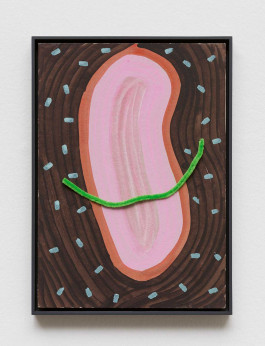 The exhibition that has now landed at Sexauer Gallery has several layers. One consists of found objects and set pieces that we use to shape this world, including pipe cleaners, earplugs, sushi bento dividers, and small polystyrene rolls. From these, Issel has created a microcosm that, if you allow yourself to follow its winding paths, proliferates and reveals the most surprising connections.