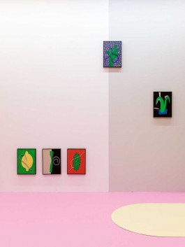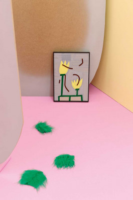 I chose to restrict myself to the medium of painting: to paint only on grey cardboard in a 42 × 30 cm format, to use only unmixed primary colors from a very limited palette, to fill the paint into broad highlighter pens, and to “draw” instead of paint. I only allowed myself to depict things that were inside the house and only use kitchen things as collage elements. I had to produce at least three paintings per day.