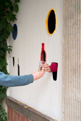 Through architectural interventions, drawings, wall objects, and performative instructions, the installation reflects on and disrupts structural inequalities in our (art) world regarding working conditions and compensation. A mural invites visitors to decide whether they feel structurally disadvantaged in terms of their working conditions. Depending on their response, they are asked to join the corresponding drink queue at the bar. Unaware, customers will encounter different drink prices – drinks will be more expensive or cheaper based on their positioning.