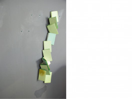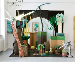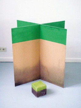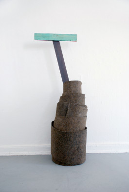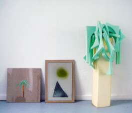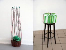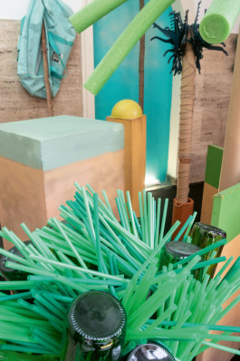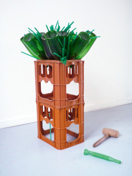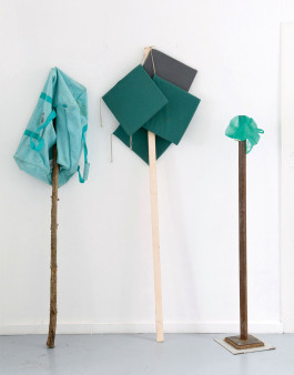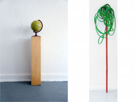 The installation Traurige Tropen (Tristes Tropiques) is made up of numerous discrete objects, some green in color and each bearing the epithet “palm.” Palm trees, those symbols of paradise, here manifest as arrangements of everyday objects bereft of their utilitarian functions. The mere attribution of palm-being, to which actually any random everyday object could be subjected, begets a gracefulness about the combinatorics of materials and formal similarity to real palms: a green travel bag attached to a stick turns into a Travel Palm, while several seat cushions on a staff form its counterpart, the Seat Palm; garden hoses, wine bottles and hammers make up a Drunken Brawl Palm. Other titles include the Techno Palm, the Block Palm, the Stone Palm, the Plinth Palm, Light Palms, Military Hare Palm, Mother-and-Child Palm, Clean Palm, World Palm, Arty-Farty Palm, Minimal Palm, Instant Palm, Disposable Palm, Beuys Palm, Franz Erhard Walter Palm, and Reyle Palm … The palms become metaphors for more or less existential aspects of life: desire, travel, sitting (as well as in “being left on the shelf”), brawling (fight), stone (construction), also for fashionable necessities, assertions, and for successful growth in the forest of the arts. Their classification is not botanical but rather a comical inversion of some “scientific” taxonomy. The title Traurige Tropen (Tristes Tropics) refers to the eponymous book by ethnologist Claude Lévi- Strauss. In the final chapter, following a thorough analysis of Amazonian societies, he talks of the futility of attempts at one- dimensional explanation, and of that eternal question mark above and inside people’s heads. As symbols of fulfillment, the palms call paradise in question. Paradise, in fact, is slogging, brawling, traveling, sitting, boozing: a secular routine that may be—once recognized as pointless—met with humor if you yourself become a palm, traveling, boozing, sitting, in the state of highest fulfillment, and laughing at yourself. ☐ Uwe Carlson