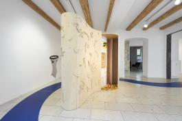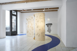 At the sculpture of an abstract bus stop, the artist applied graffiti made from salt dough—a fragile, homemade material more often associated with domesticity and childhood than with public intervention. Here, digital aggression meets soft substance, transforming into a quiet, ironic form of resistance.
