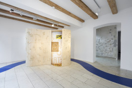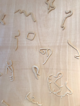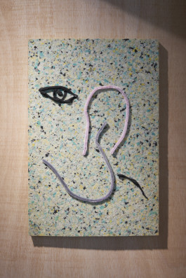 2019, wood, salt dough, chalkboard chalk, pastel chalk, with three paintings,